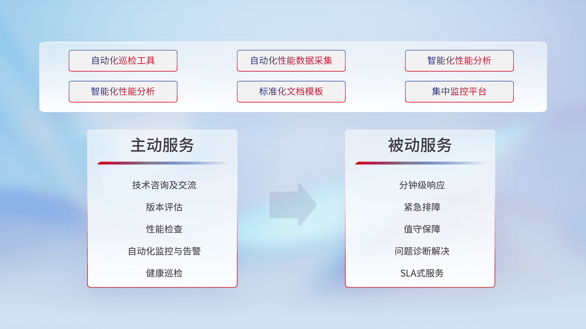 智能化工具和标准化文档,,,保障服务质量,,提供主动服务(包含技术咨询、、、版本评估、、性能检查、、、自动化监控与告警、、、、健康巡检)和被动服务包含(分钟级响应、、、紧急排障、、、、值守保障、、、问题诊断解决、、、、SLA服务)。。